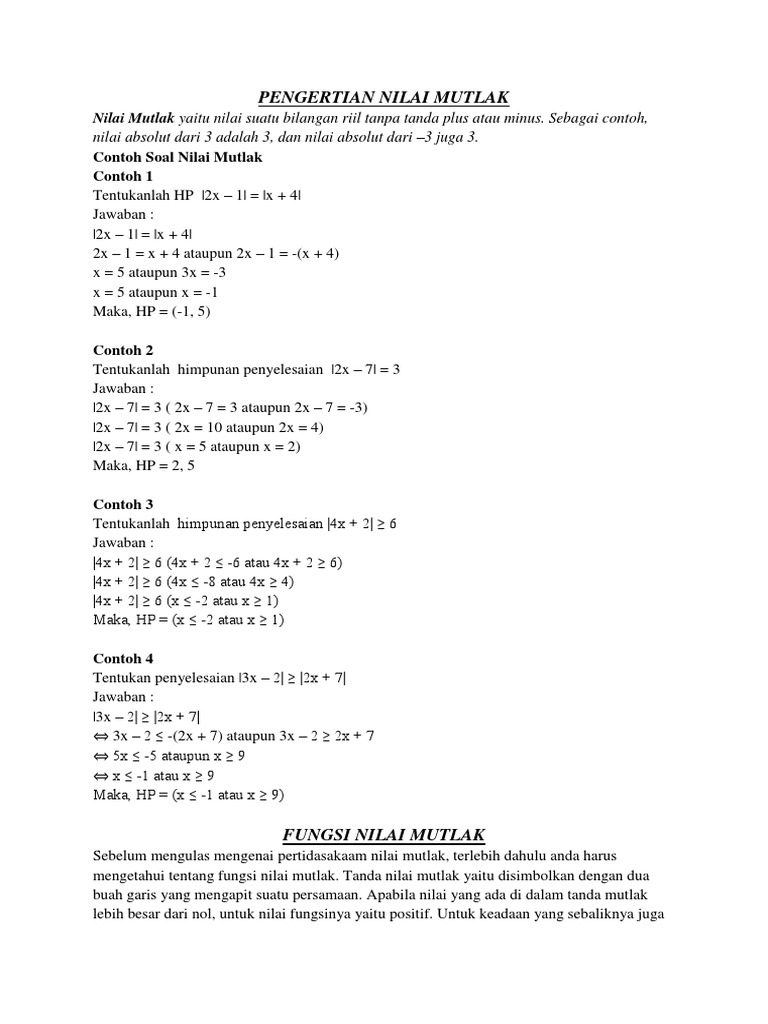 .mutlak.jadi,harga mutlak atau nilai mutlak adalah suatu konsep dalam matematika yang menyatakan selalu positif.secara x =3 maka x2 =9. Dengan mengisolasi simbol nilai mutlak baru kemudian menerapkan sifat persamaan nilai mutlak, kita mendapatkan Persamaan diatas merupakan persamaan nilai mutlak. Dapatkan informasi, inspirasi dan insight. Akan diselesaikan persamaan nilai mutlak tersebut.